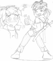 Despite his dark past, he is a unnervingly enthusiastic young adult. He`s very energetic and smiles a lot...sometimes too much! He was handed down the "Chopstick Katanas" from his grandfather, the leader of the tribe. These weapons look like two small chopsticks, but can transform into two long, slender katanas when a sushijin holds them. He`s known for his amazing speed and overzealous nature.